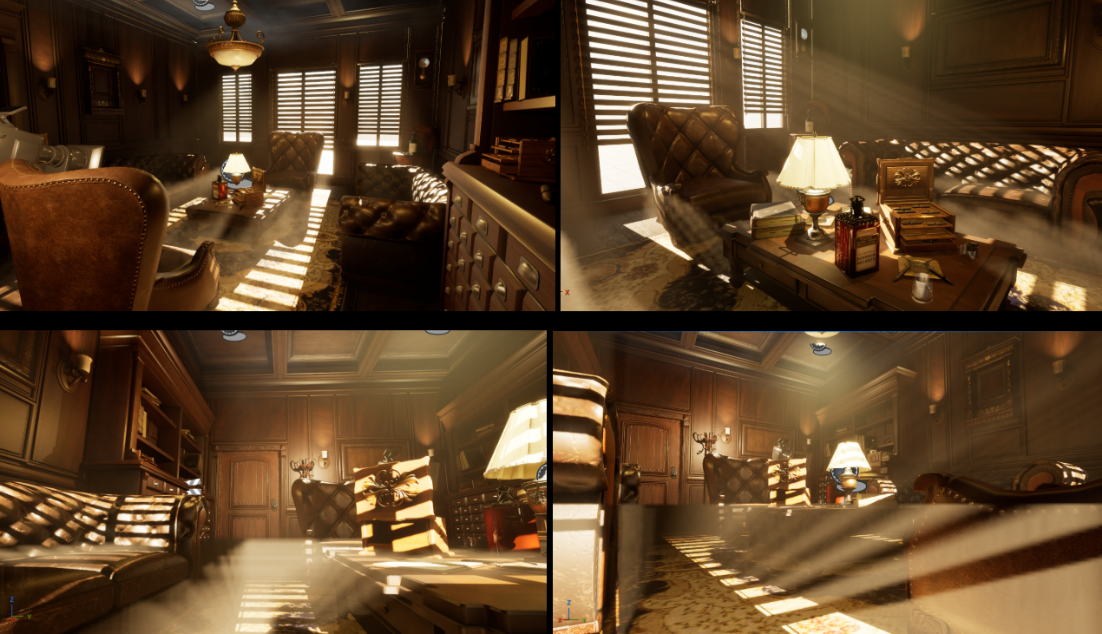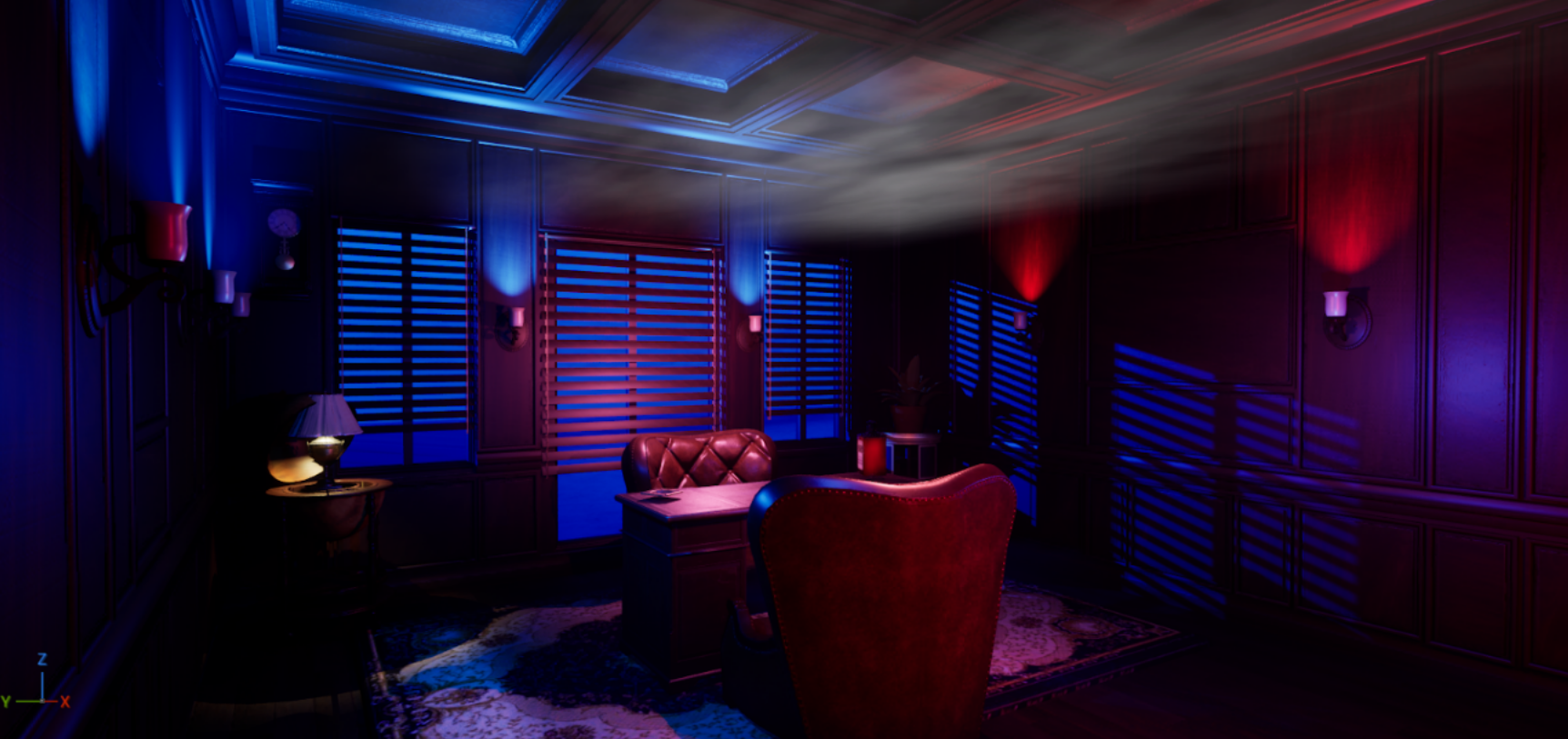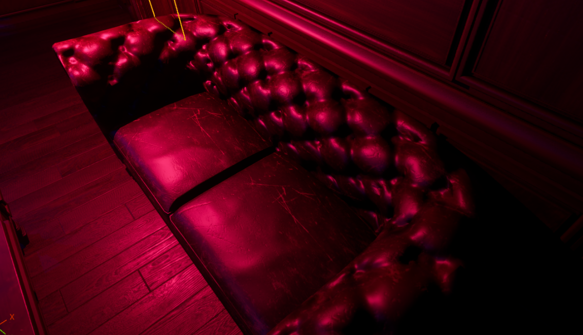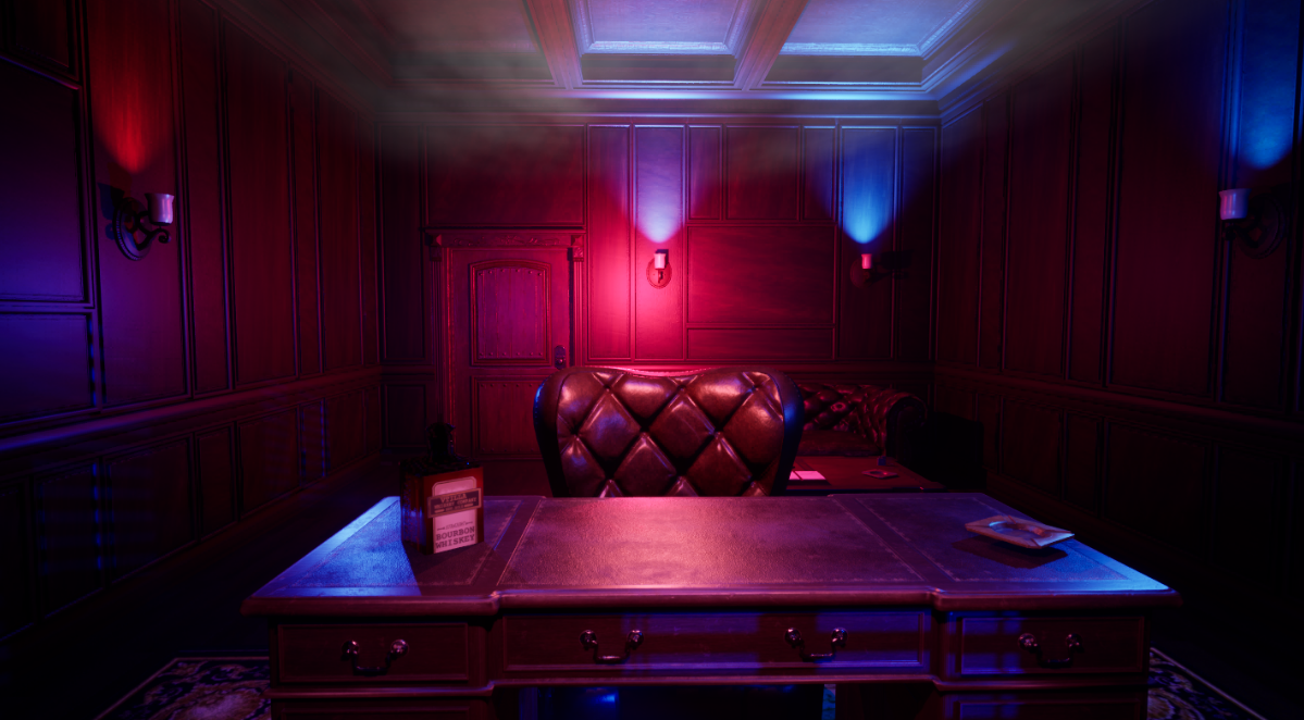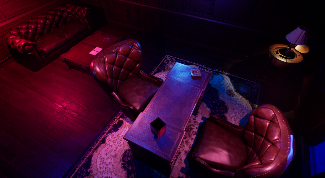 The project focused on the narrative reinterpretation of a pre-existing 3D environment, transforming a mansion living room into a gangster’s office set within a nightclub nightlife atmosphere.